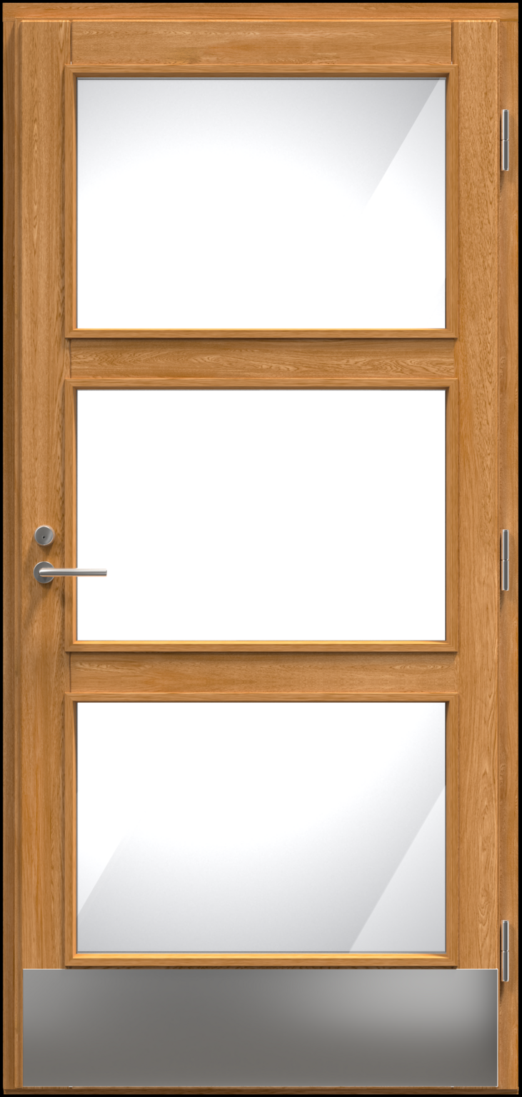 Kvistfritt limmat ramträ. Kraftig karm av kvistfri furu, laserad till samma nyans som dörrbladet. Tröskel av oljelaserad björk och aluminium, 25 mm hög. Modulstorlekar 9/10–20/21.