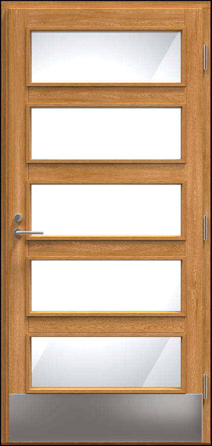Kvistfritt limmat ramträ. Kraftig karm av kvistfri furu, laserad till samma nyans som dörrbladet. Tröskel av oljelaserad björk och aluminium, 25 mm hög. Modulstorlekar 9/10–20/21.